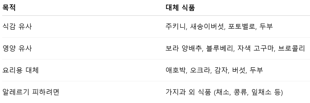 가지 알레르기나 소화 문제, 또는 개인적인 기호로 인해 가지를 피해야 하는 경우, 비슷한 영양적 가치 또는 조리 방식을 갖는 식품들로 대체할 수 있습니다.