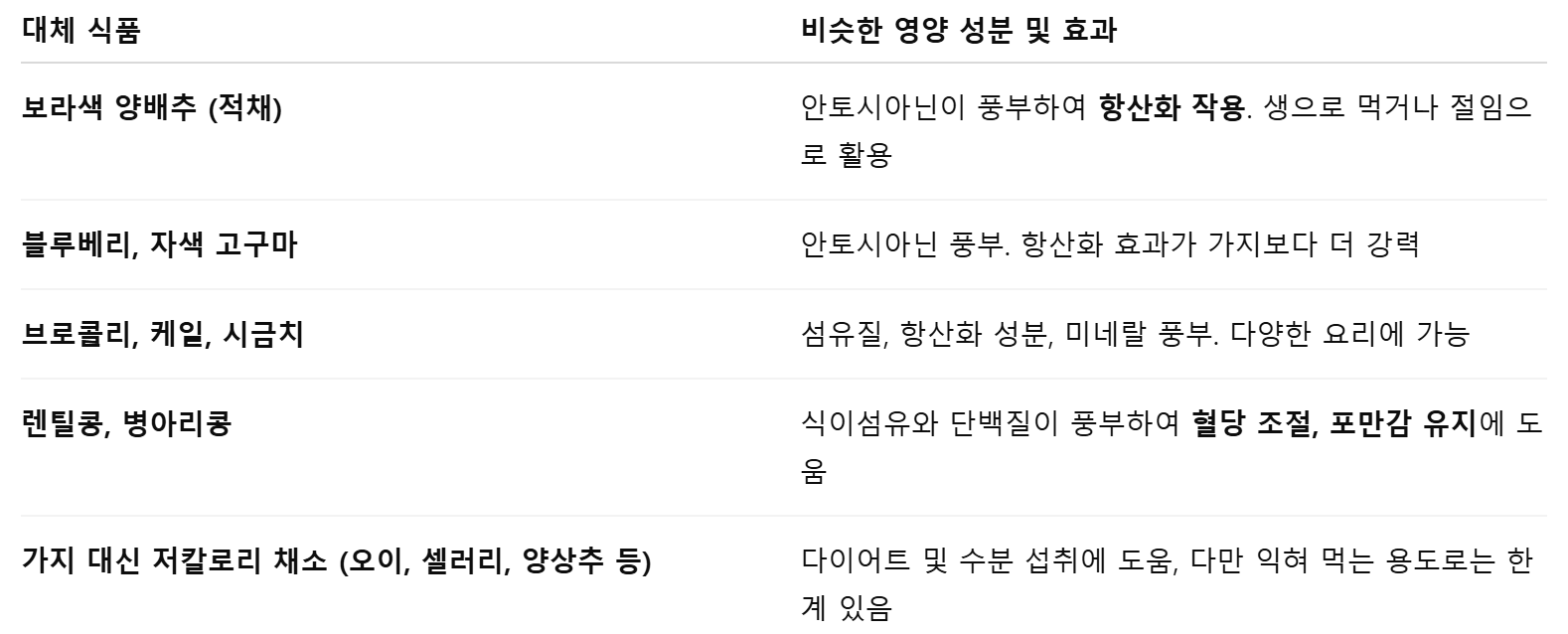 5 . 가지 대체 식품 요약표