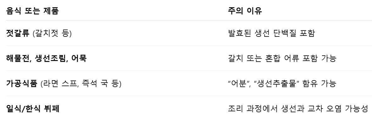 - 고등어, 꽁치, 참치, 연어 등 다른 생선류와도 교차 알레르기 발생 가능