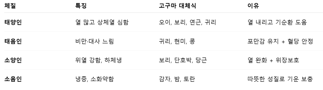 8. 체질별 고구마 대체식 추천 및 고구마 vs 대체식 영양 비교표