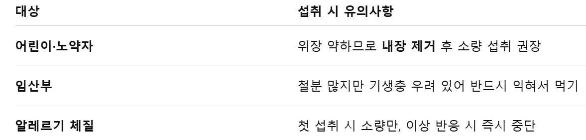 예방: 소화 기능이 약한 사람은 소량만 섭취하거나 내장을 제거한 후 먹는 것이 좋습니다.