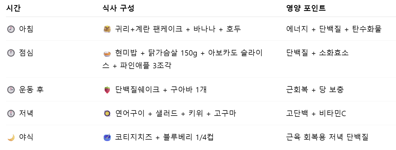 - 포인트: 동물성과 식물성 단백질 조합 + 회복에 좋은 과일 선택