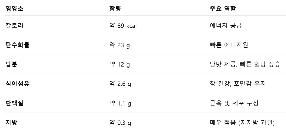 1. 바나나의 주요 영양소 (100g 기준, 중간 크기 바나나 약 1개)