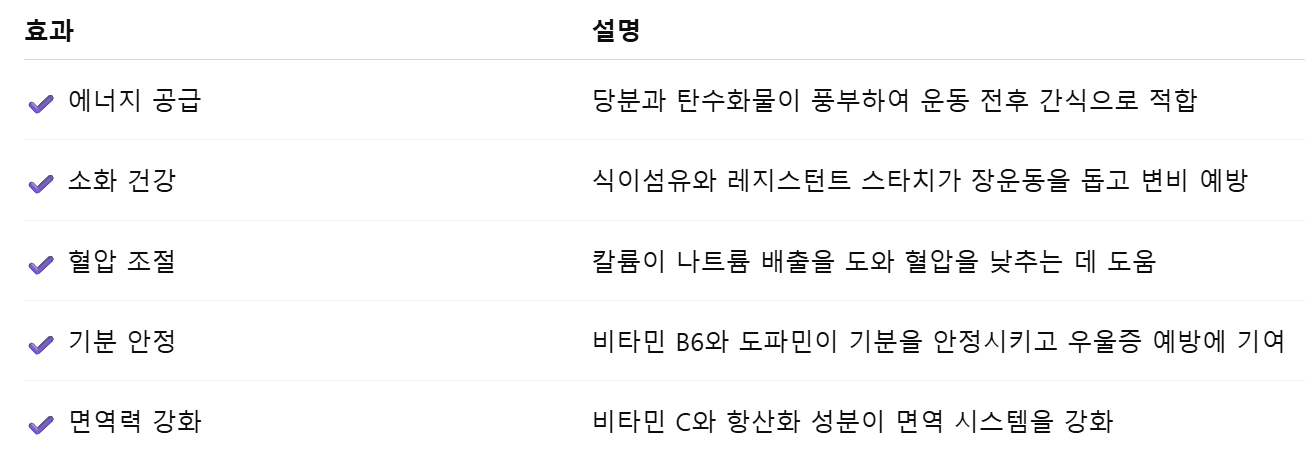 - 장점: 바나나는 비타민 B6가 풍부하여 기분 개선 및 생리 전 증후군(PMS) 완화에 도움