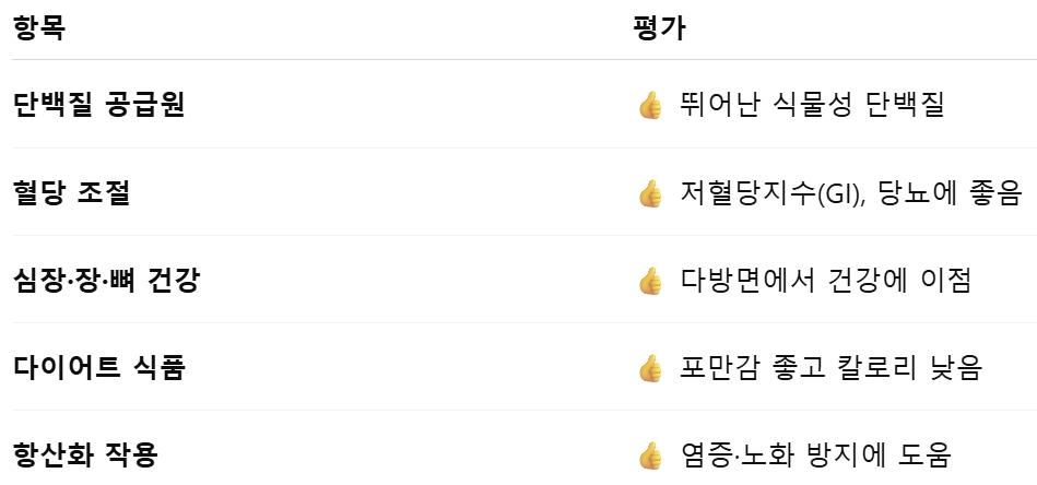 ☞ 곡류(예: 현미, 보리)와 함께 먹으면 아미노산 조합이 완전 단백질 수준이 됩니다.