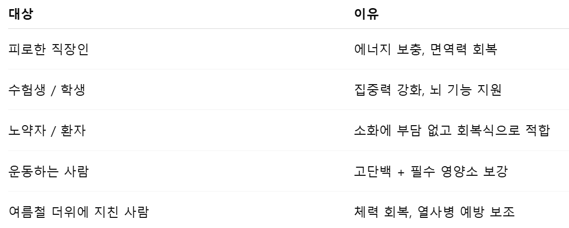주로 면역력 강화, 피로 회복, 원기 회복에 도움을 주며, 사용되는 재료 각각이 건강에 긍정적인 영향을 미칩니다.