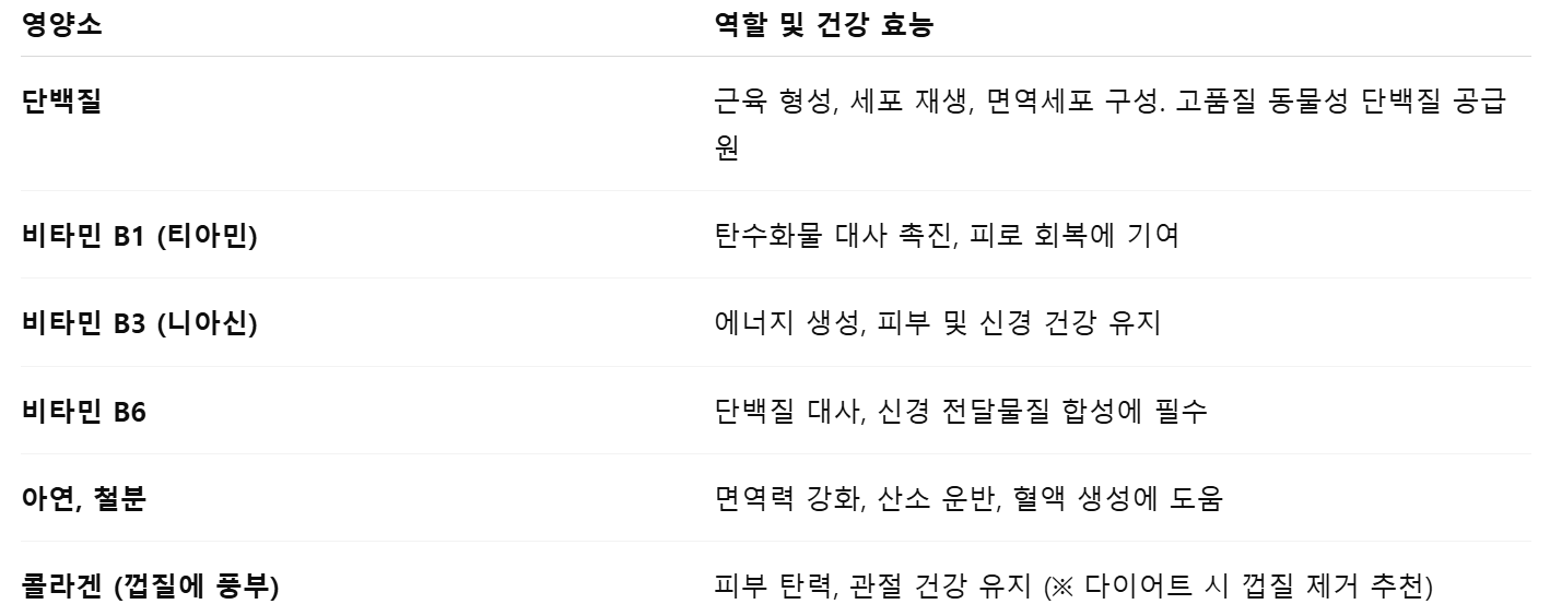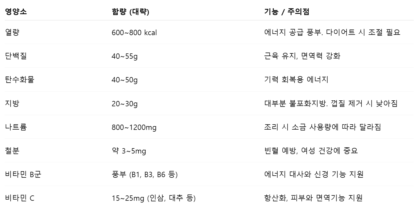 보양식으로 주로 먹는 삼계탕은 주로 닭고기, 찹쌀, 인삼, 마늘, 대추, 밤 등으로 구성되며, 다음과 같은 영양소들이 풍부합니다.