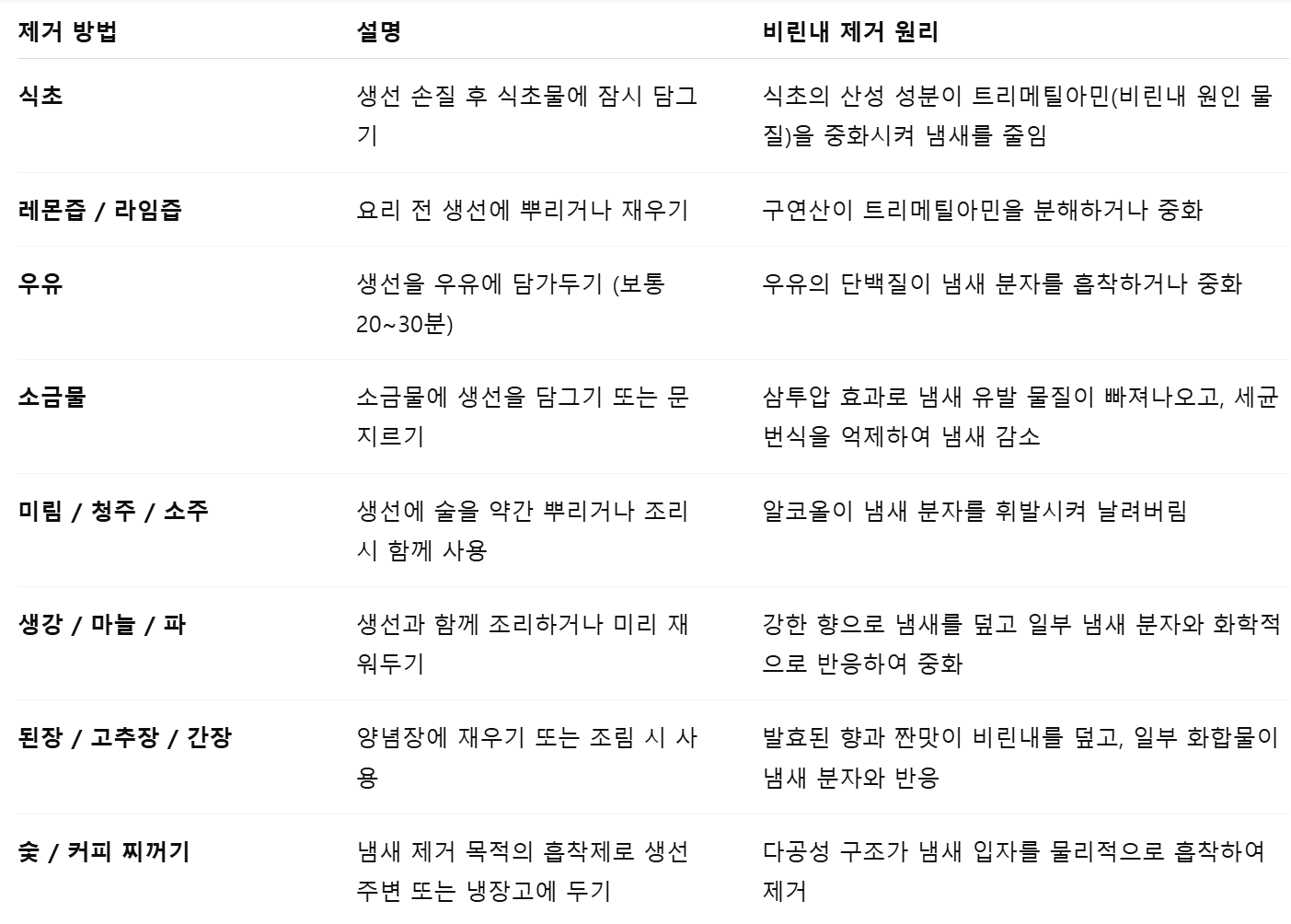 위 내용을 바탕으로 한 생선 비린내 제거 방법에 관해 살펴보겠습니다.
