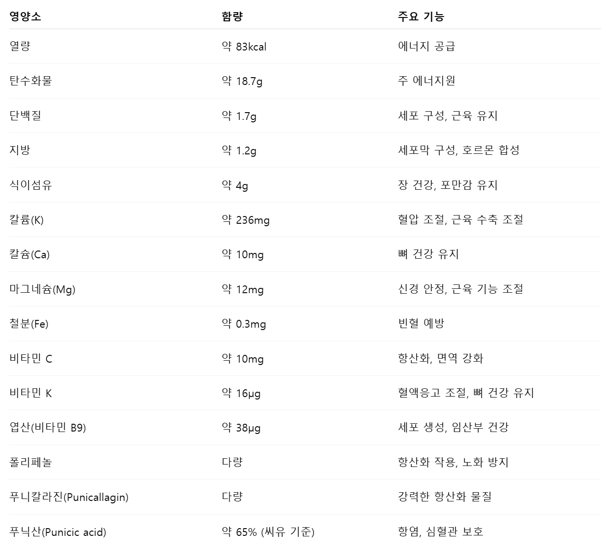 이처럼 석류는 단순한 과일이 아니라, 비타민·미네랄·항산화 물질이 고루 들어 있는 복합 영양식품이라 할 수 있습니다.