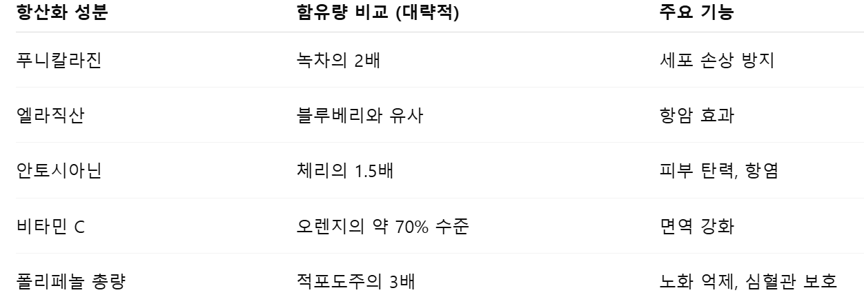 이 물질들은 우리 몸의 활성산소(ROS)를 제거해 세포 손상을 막고, 노화 속도를 늦추며, 암세포 증식 억제에 도움을 줍니다.
