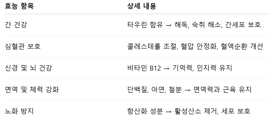 ① 혈압 안정화: 타우린과 마그네슘은 혈관을 이완시켜 혈압을 낮추는 데 도움.