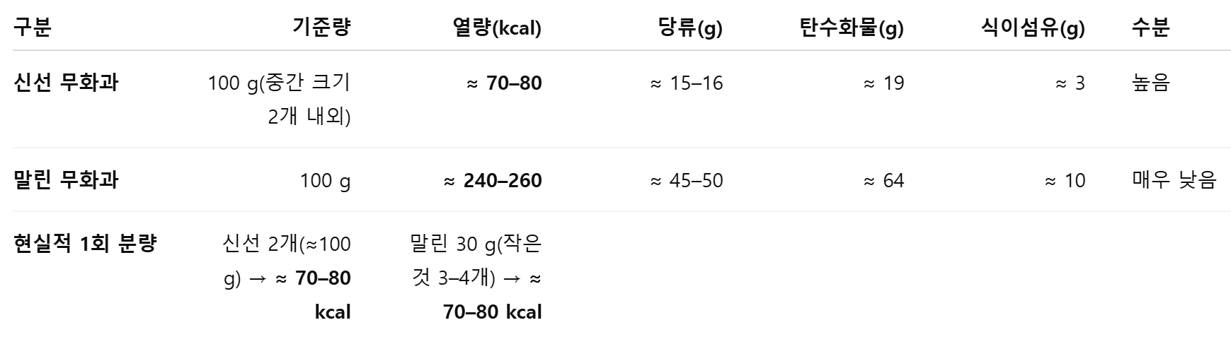 - 당·당부하: 말린 무화과가 훨씬 높음(수분이 빠져 당이 농축)