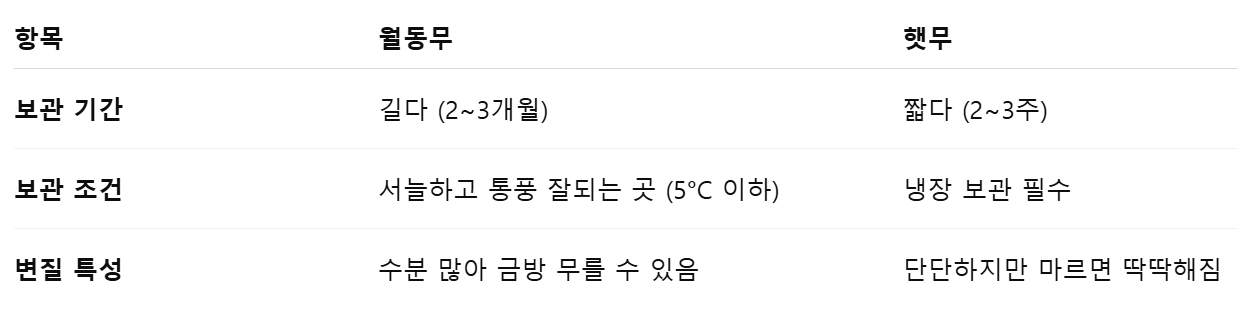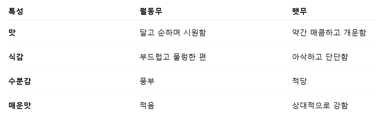 월동무는 추운 겨울을 거치며 전분이 당분으로 전환되어 맛이 달아집니다. 햇무는 빠르게 성장하면서 매운 맛 성분(이소티오시안산염)이 더 남아있습니다.