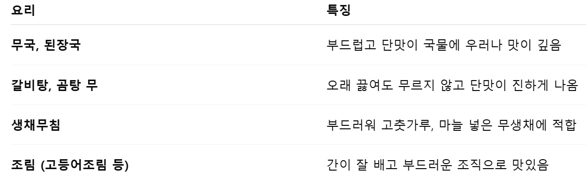 : 부드럽고 달큰한 맛을 활용한 국물 요리나 생채에 적합합니다.