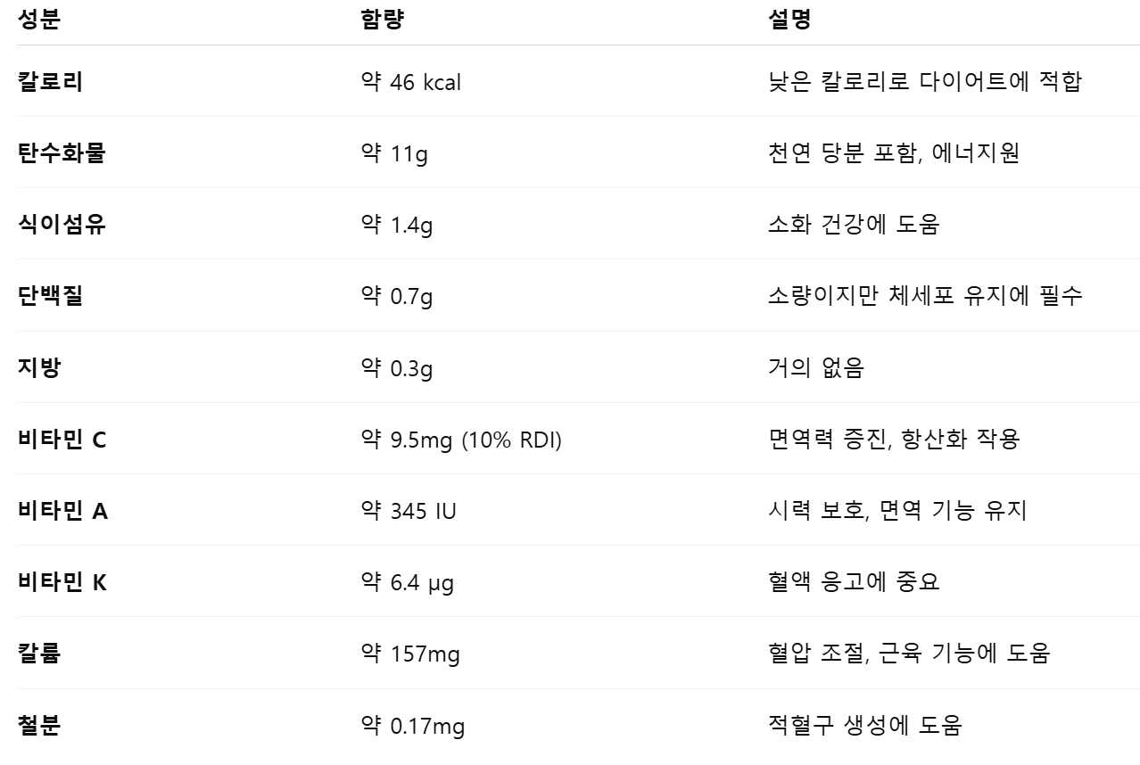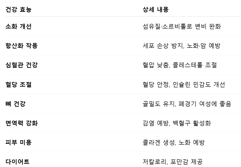 - 식이섬유가 풍부(100g당 약 1.4g)하여 장 운동을 촉진하고 변비 해소에 도움.