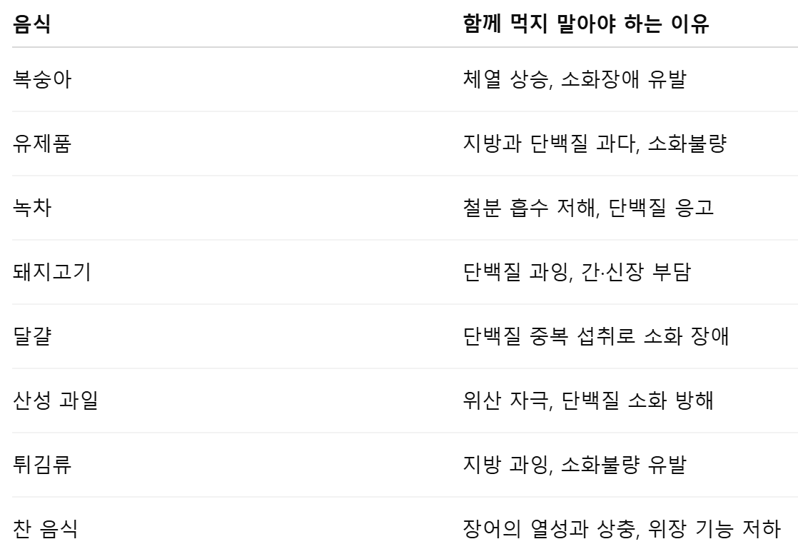 ① 이유: 장어는 따뜻한 성질의 식품으로, 차가운 음식과 함께 먹으면 소화기관의 균형이 깨지고, 속이 차가워지거나 복통이 생길 수 있습니다.