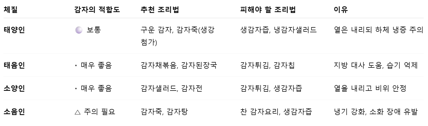 → 소양인은 열이 쉽게 오르므로 감자의 서늘한 성질이 도움이 되며,