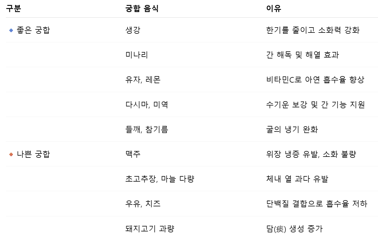 - 따뜻한 식재료와 함께: 생강, 대파, 참기름, 들깨 등을 넣어 한기를 완화.