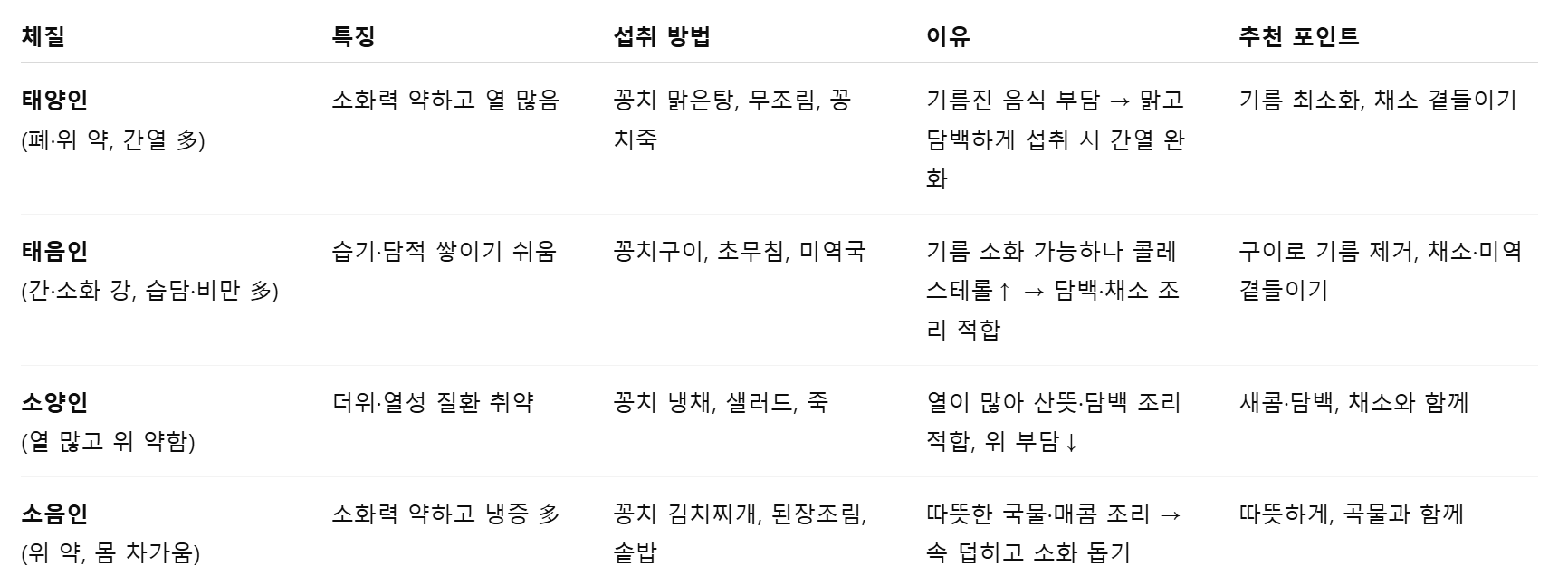 5. 체질 따라 달라지는 꽁치의 맛과 효능 및 체질별 섭취방법 요약 표