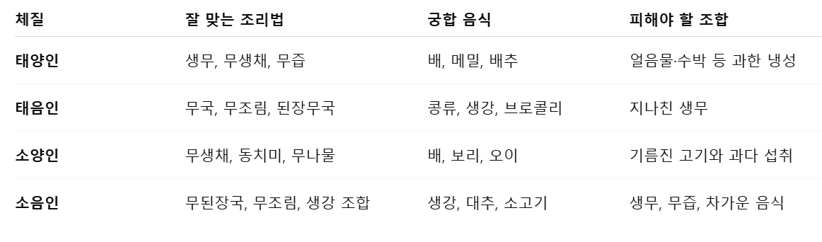 5. 체질별 무와 함께 먹으면 좋은 음식 요약 표 및 정리