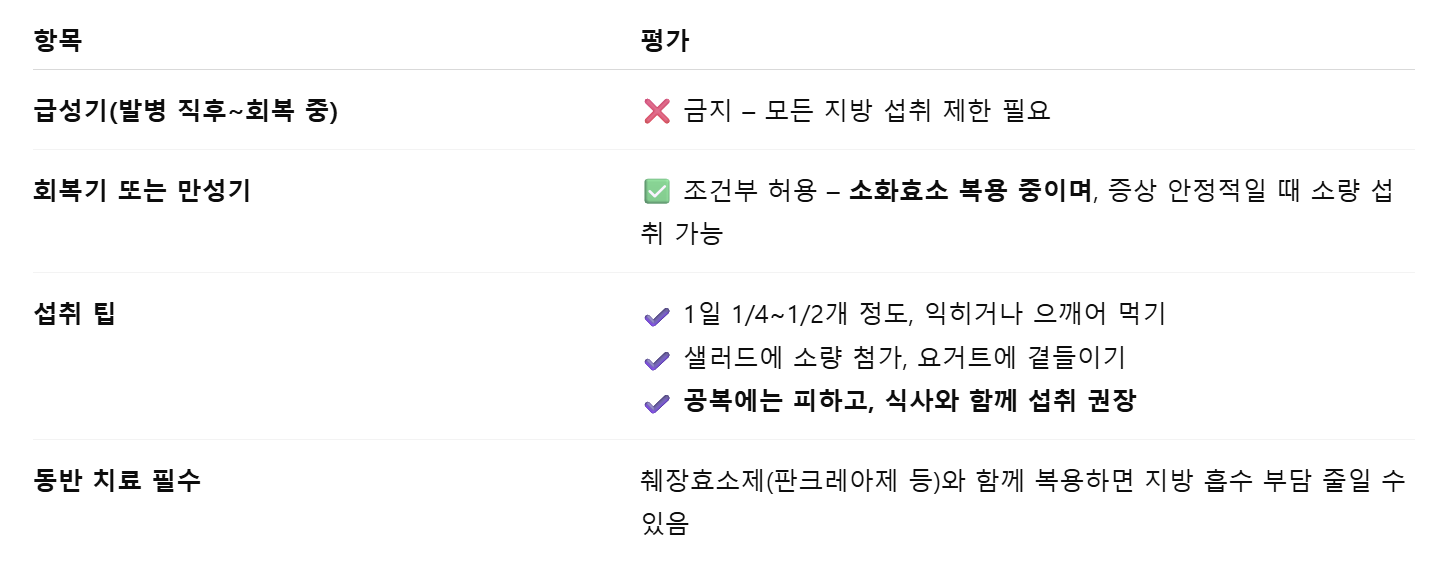만성 췌장염 환자 중 소화효소 보충제를 복용 중인 경우, 적당량 섭취는 괜찮을 수 있음
