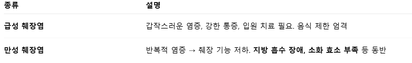 췌장염은 췌장에 염증이 생기는 질환으로, 다음과 같은 두 가지 형태로 나뉩니다.