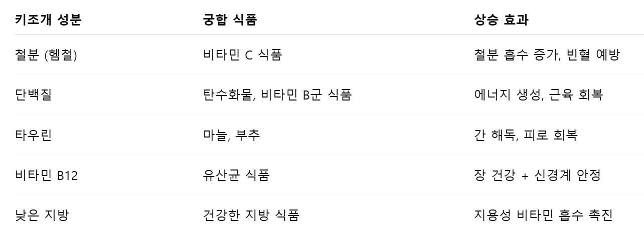 - 키조개의 철분은 동물성 철(헴철)로 흡수율이 높지만, 비타민 C와 함께 먹으면 흡수율이 더욱 향상됨.