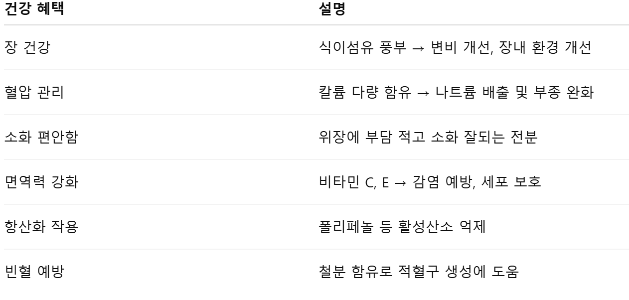 1. 풍부한 식이섬유 → 장 건강 & 변비 예방