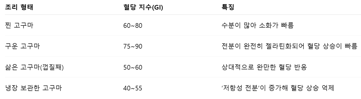 즉, 어떻게 조리하고, 어떻게 먹느냐에 따라 같은 고구마라도 혈당 반응이 2배 이상 달라질 수 있습니다.