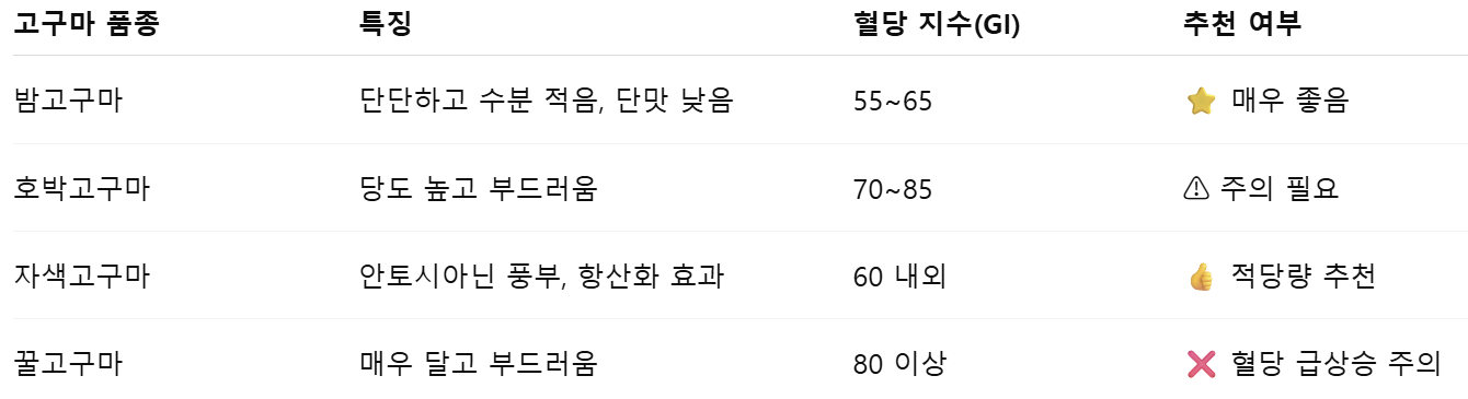 따라서 밤고구마나 자색고구마가 혈당 관리에 가장 유리합니다.