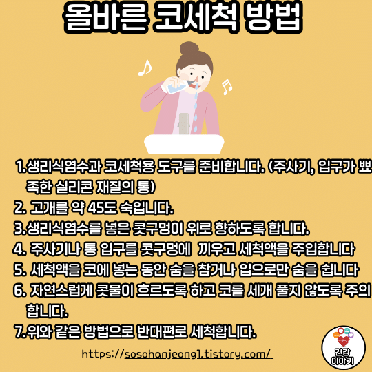 ☑ 코 세척 : 생리식염수로 코를 세척할 수 있습니다. 이때 고개를 숙인 채로 생리식염수가 코를 통과해 목 뒤로 넘어가지 않도록 지시된 방법대로 올바르게 세척하는 것이 중요합니다.