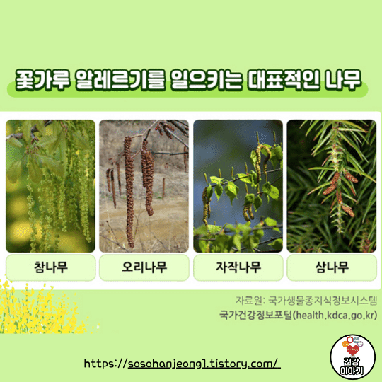 꽃가루 알레르기를 유발하는 나무는 참나무, 오리나무, 자작나무, 삼나무이며 주로 4월 ~6월 초까지 꽃가루 수치가 높은 편입니다. 단 제주도의 경우 2월 ~4월 초까지 꽃가루 수치가 높은 편입니다.